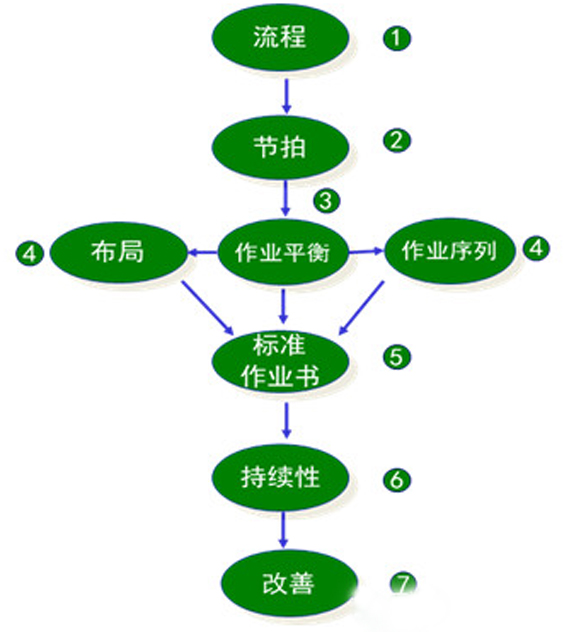 一旦确定了节拍时间,也就决定了在那个时间里完成工作的每个人的作业量,但是,这种情况下不将一般工作研究中的剩余率计算在内。 这种情况下的工作速度、熟练度等标准,由组长自己设定。因此,当新人能用与组长相同的时间工作的时候就说明他可以独挡一面了。 决定了节拍时间后,就会由于制作人的不同而产生个人差异。并且因为不考虑剩余,所以任何一个人都明白是否有浪费,这又与改善相关。也就是说,这就给了工厂一个改善的思路:比周期时间多出了一点时,我们该进行怎样的改善才能遵守周期时间呢。那就是建立标准的作业次序,作业顺序是指在作业者加工物品时,从原材料向产品次第变化的过程,它包括运输物品、在机械上安装拆卸等,这是伴随着时间的流动而进行作业的顺序,不是指产品流动的顺序。如果不明确这个作业顺序,每个人就会按照自己喜欢的任意的顺序进行工作,那么即使是同一个人进行相同的作业,每次的顺序也会有所不同。 还有,如果不遵守这个作业顺序,就会使忘记加工或安装错误的产品流向后工序,造成机器破损、安装生产线停止等情况,甚至会出现召回车。