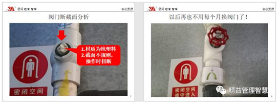 我查看那个阀门损坏的现物,通过断截面,可以判断这个水管阀门是PPR全塑料材质的阀门。从断截面的痕迹,可以判断,主要是在开关阀门时,因为塑料材质的阀门强度不够,操作时力度超过塑料阀门抗扭力的强度而断裂。简而言之,就是硬生生的被扳断的。可见,只是通过简单的更换回原来的塑料阀门,是不能从根本上解决这个问题的。我终于知道改善活动没少举办,但是改善提案却很少的原因。