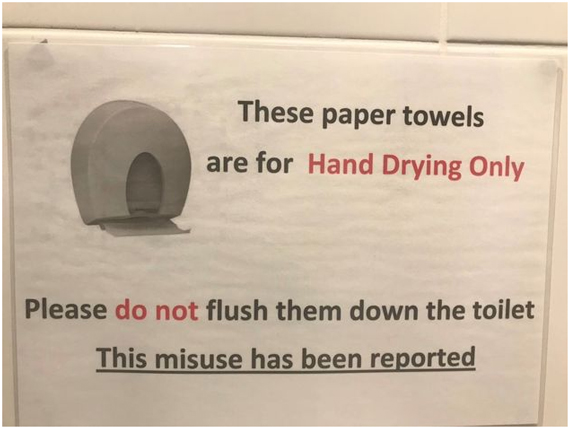 然后,我们要注意到一个根本问题:如果便池堵住,使用者就不能上厕所。 所以,标语中最后一段“这种滥用行为已被汇报给我们了”,应该改为:“否则会造成厕所堵塞。如果出现卫生纸短缺等情况,请向XXX办公室汇报。”